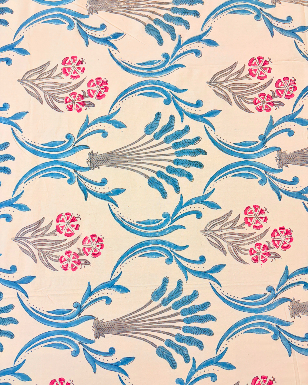 Design: Authentic Handblock Print with floral motifs in blue & pink hues on a beige background