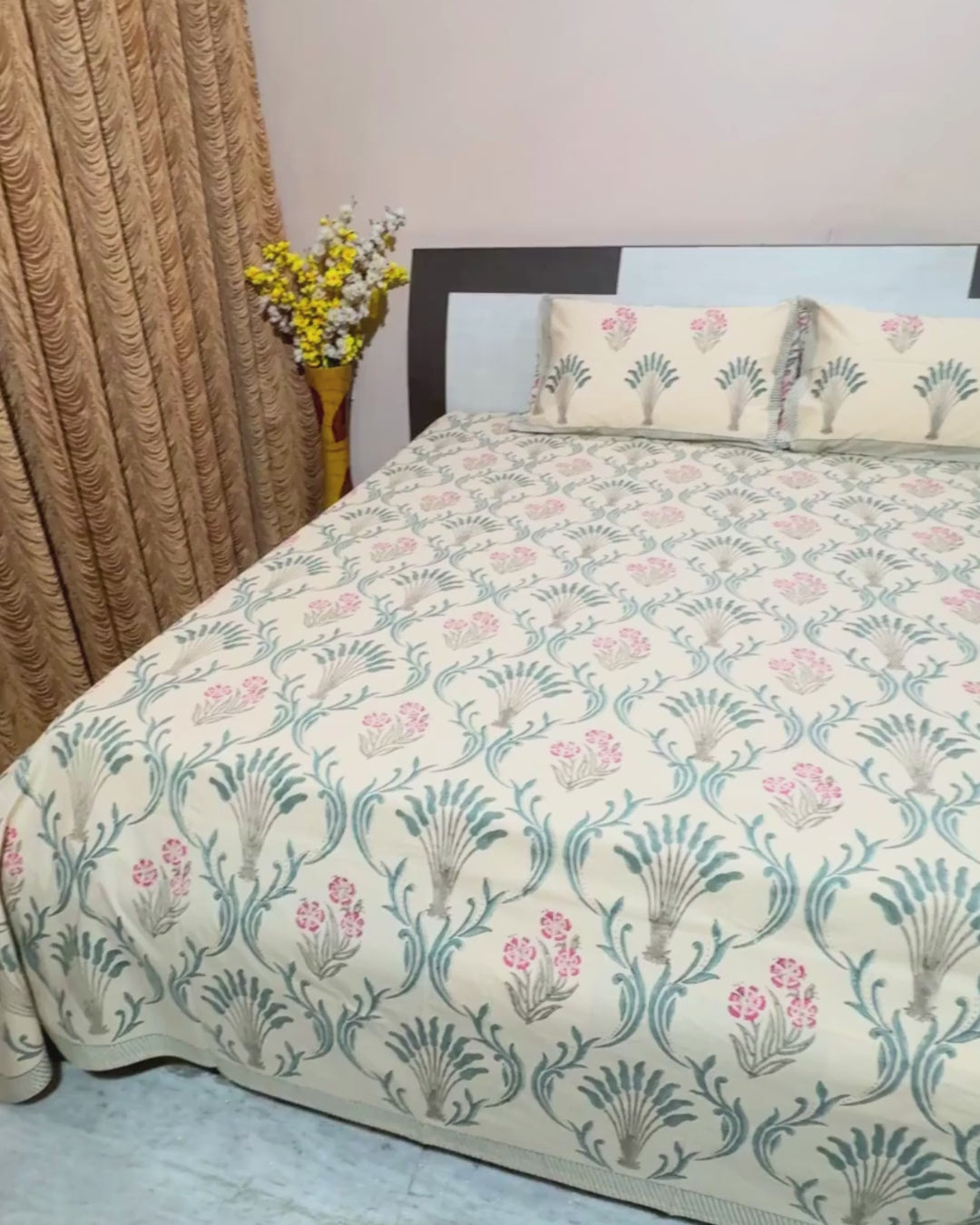 Transform your bedroom with this handcrafted pure cotton handblock printed bedsheet, a blend of elegance and tradition. Made with love by skilled artisans, this bedsheet brings timeless Jaipuri craftsmanship into your modern home.
